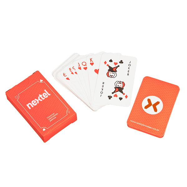 Jogo de baralho com 54 cartas em papel couche 300gr. Caixa em cartão 300gr. Medidas: 8,5 x 5,5 cm. Personalização em impressão nas cartas e na caixa.