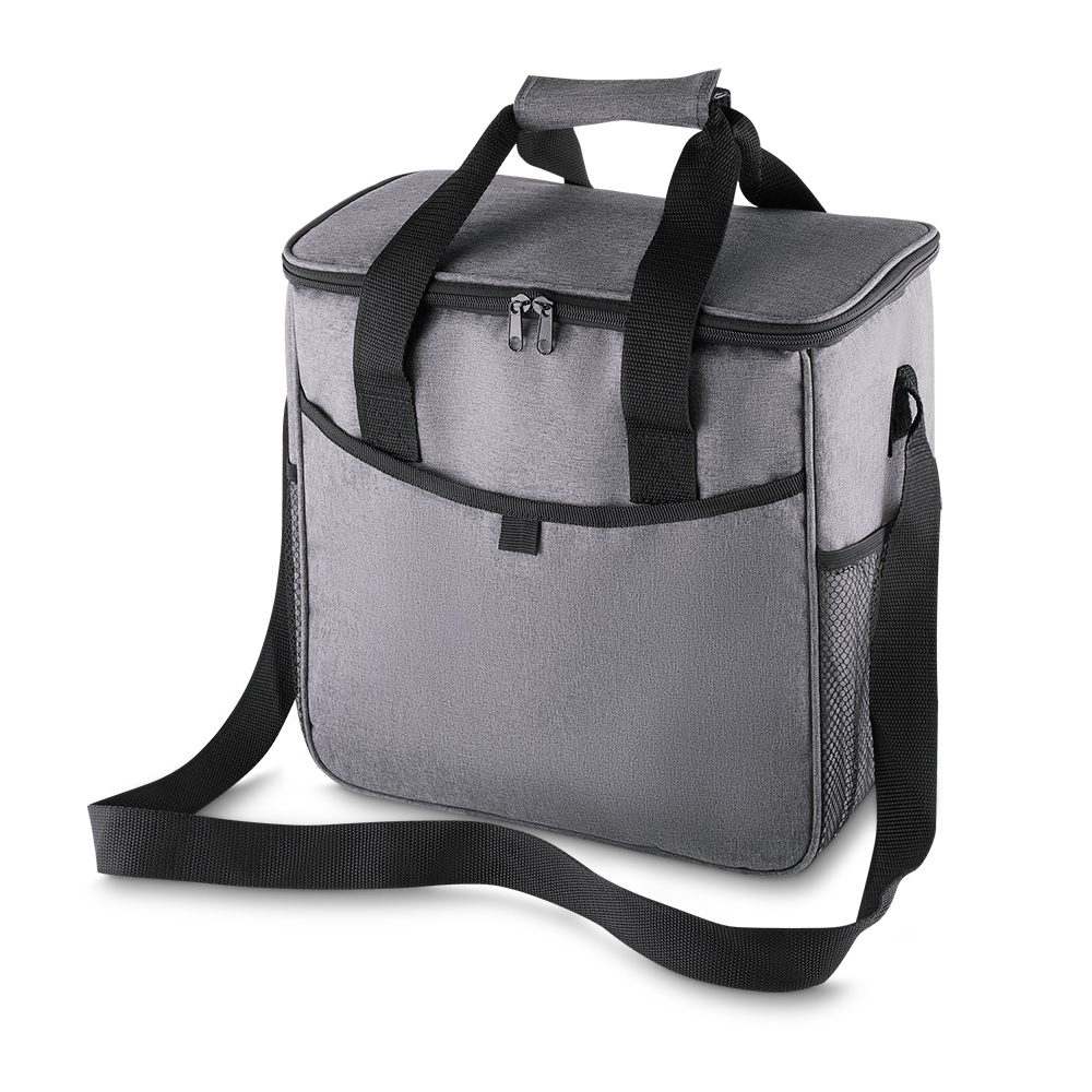Bolsa térmica, capacidade 16 litros, tecido nylon e poliéster, bolso frontal, alça de ombro regulável, parte interna soldada para retenção de líquidos. Tamanho total aproximado: 33x32x16cm. Gravação em silk.
