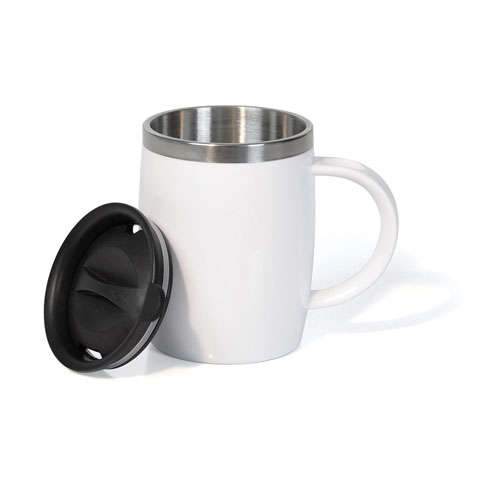 Caneca em Aço Inox com revestimento de Poliestireno branco e tampa em Polipropileno. Capacidade: 400 ml. Personalização em Silkscreen.