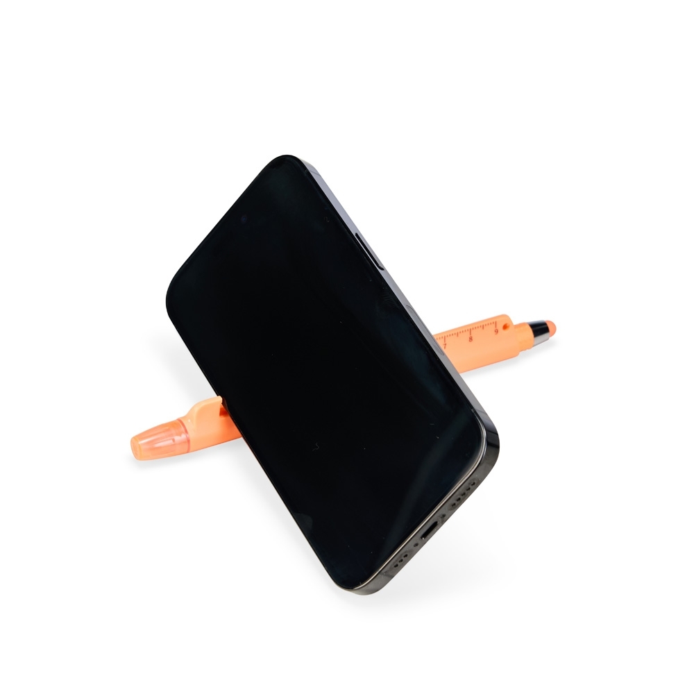 Caneta plástica marca-texto de ponta chanfrada com tampa protetora. Conta com uma régua de 9 centímetros e abridor de garrafas integrados ao corpo da caneta, além de uma caneta menor, destacável da estrutura principal, com ponteira emborrachada para interação com telas sensíveis ao toque e carga esferográfica azul de 1.0mm 9169