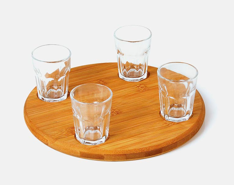 Conjunto para dose com base em Bambu. Conta com tábua em Bambu e 4 copinhos de vidro para dose. Os copinhos têm design retrô, é fácil de pegar e muito resistente. Personalização a laser.