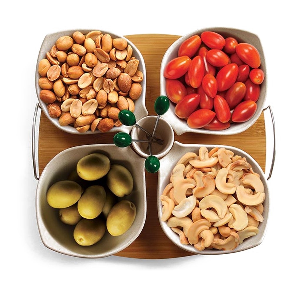 Conjunto para petisco em Bambu/Fibra de Bambu. Acompanha cinco potes em Fibra de Bambu; quatro garfos em Aço Inox com ponta em formato de azeitona; base em Bambu com alças em Aço Inoxidável. Dimensões da base: 24x24cm. Personalização a laser.