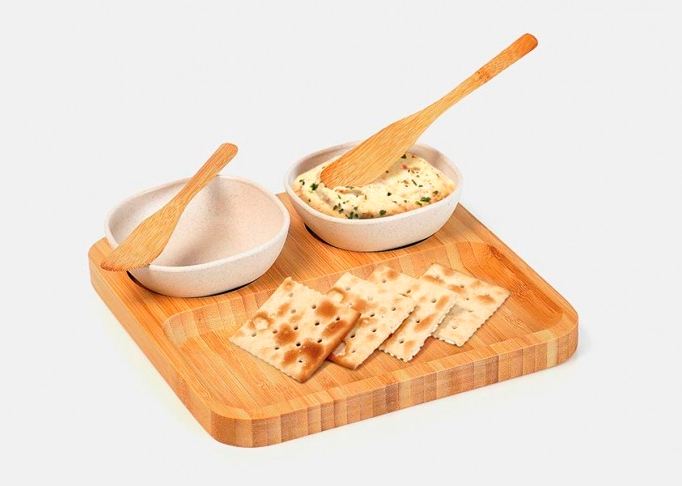 Conjunto para petiscos e patês em Bambu/Fibra de Bambu. Acompanha dois potes em Fibra de Bambu, base e duas espátulas 14cm em Bambu. Dimensões da base: 21,5x21cm Dimensões do pote 9,5x3cm. Personalização a laser.