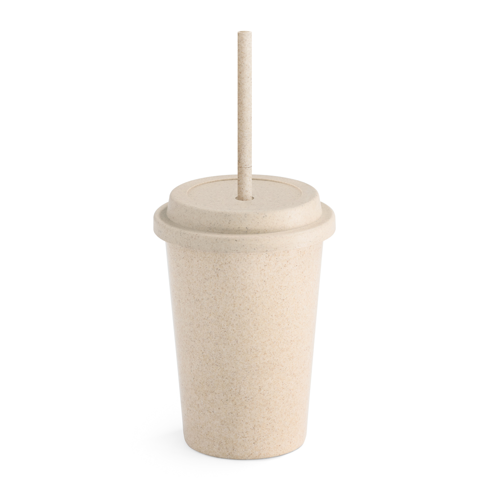 Copo de viagem em Fibra de bambu e PP. Com canudo retrátil. Capacidade: 450 ml. Food grade. Tamanho: Ø93 x 135 mm. Personalização SilkScreen.