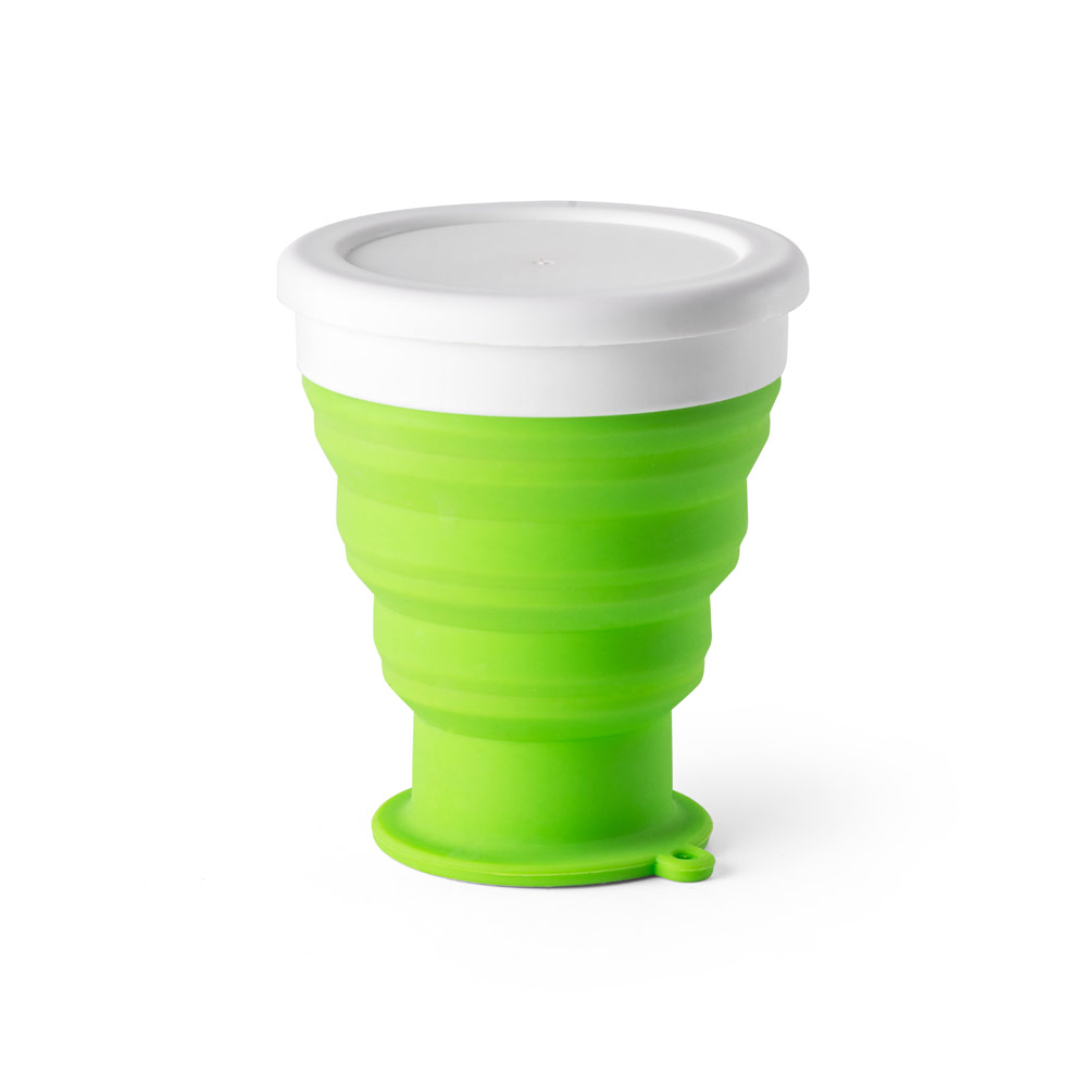 Copo de viagem dobrável em silicone com tampa em PP. Contém uma argola na base que serve como pega ou para pendurar. Copo com capacidade até 400 ml. Tamanho total aproximado: ø66 x 117 x 96 mm. 94695. Personalização em Tampografia.