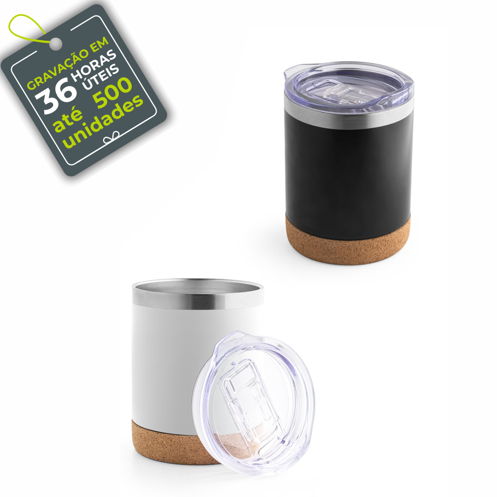 Copo de viagem em aço inoxidável com parede dupla isolada a vácuo, acabamento fosco e base em cortiça (térmico). Contém uma tampa transparente com fecho deslizante. Capacidade até 400ml. Certificação EU Food Grade. Acompanha embalagem individual. Tamanho total aproximado: Ø93 x 121. mm. 94327.