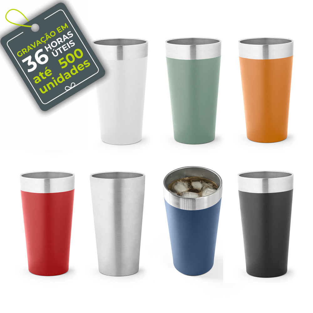 Copo de viagem térmico em aço inox com parede dupla isolada a vácuo. Ideal para preservar as suas bebidas frias ou quentes. Capacidade até 540 mL. Acompanha embalagem individual kraft. ø85 x 154 mm. 94267. Personalização em Laser.