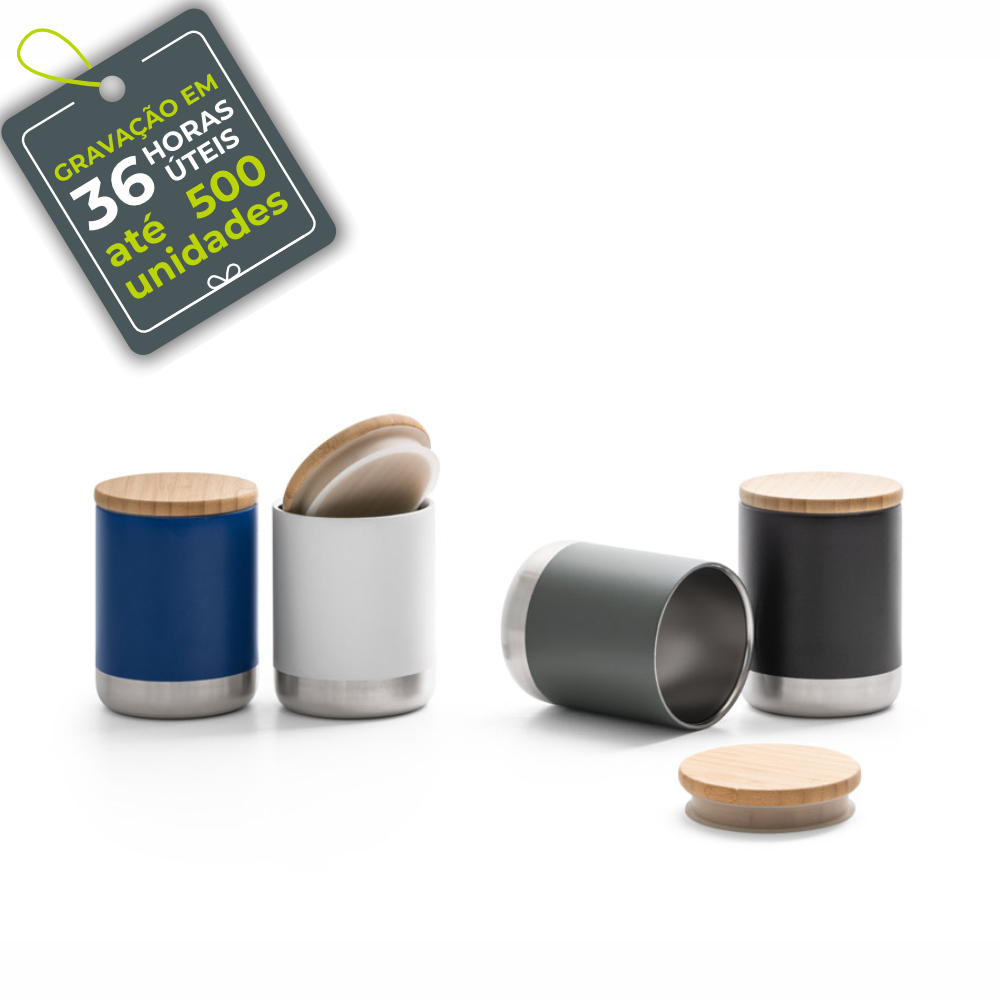 Copo de viagem em aço inox, térmico com parede dupla isolada a vácuo. Parede interna revestida de cobre e tampa em bambu com vedante de silicone para proteção extra. Capacidade até 370 mL.