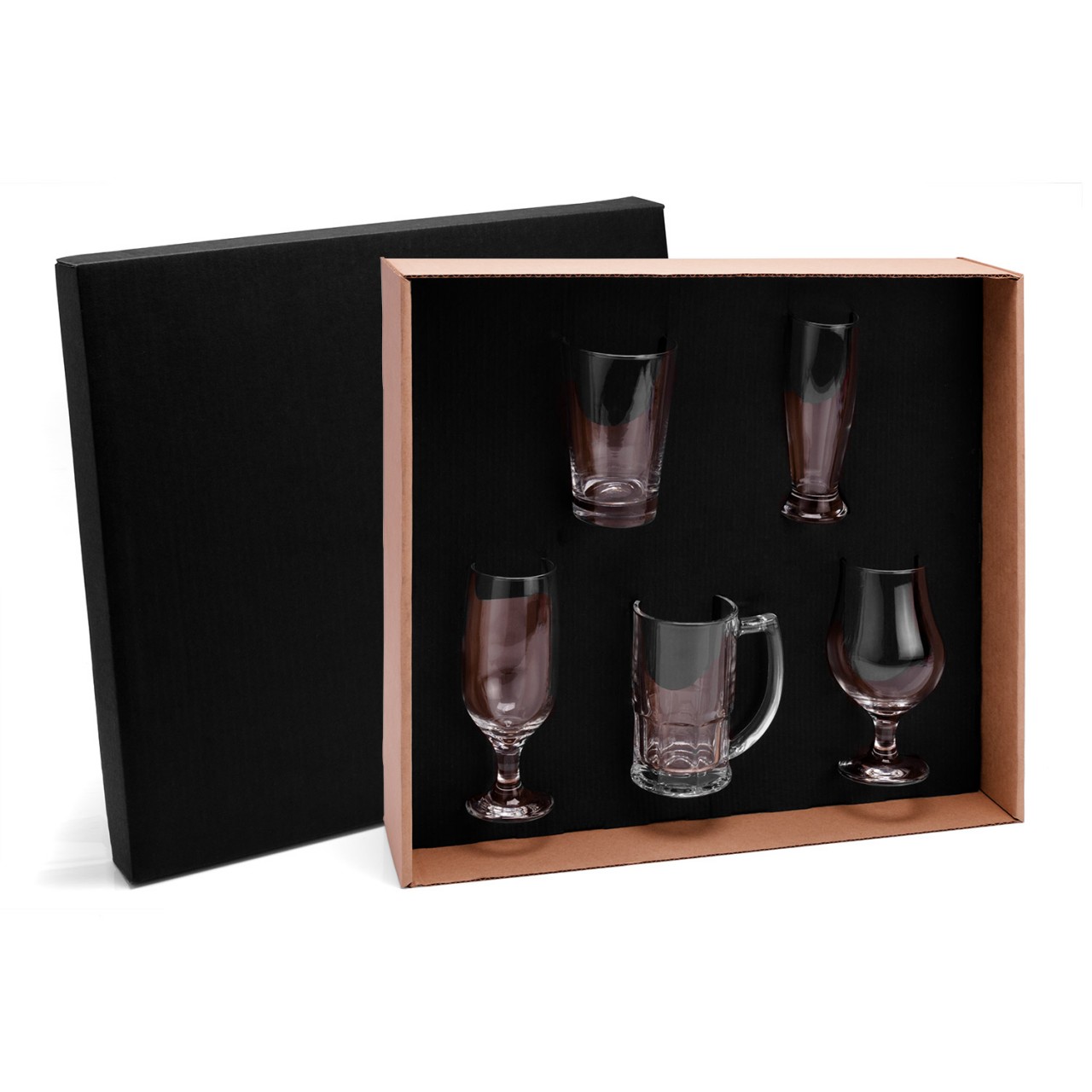Jogo de copos para cerveja em Vidro. Conta com 1 caneca, 2 taças e 2 copos para cerveja / chopp. Personalização em Laser.