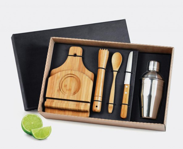 Kit caipirinha com tábua em Bambu, faca para frutas 4" em Inox/Bambu, pilão, colher de 18cm e base para a tábua em Bambu e coqueteleira em Aço Inox. Acomodados em uma caixa para presente. Dimensões da tábua: 22x13x1,2cm Dimensões da base: 13x12x2cm. Personalização a laser.