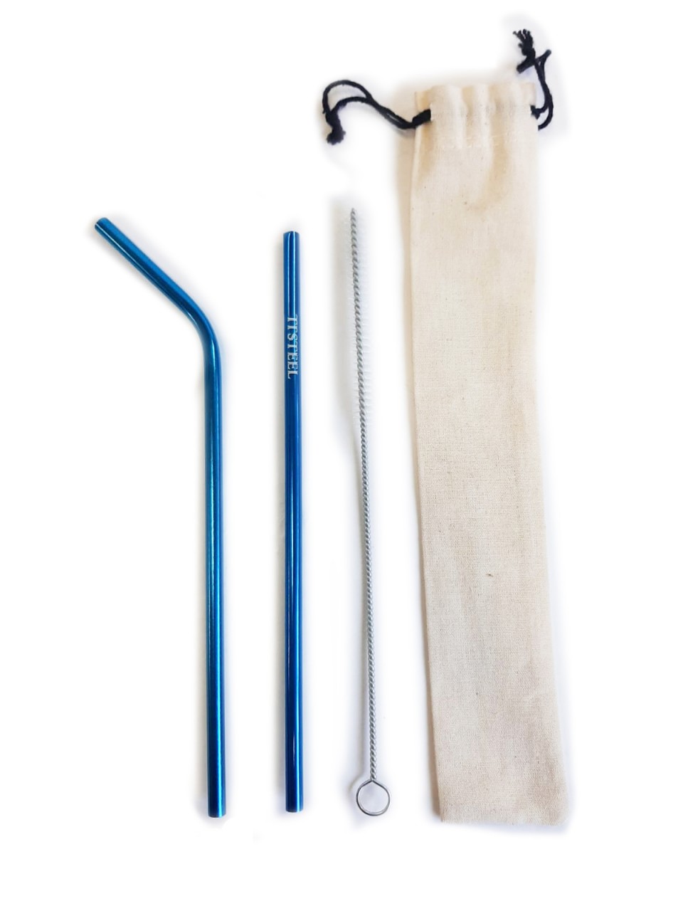 Kit com 2 canudos de aço e 1 limpador. Contém canudo reto e canudo curvado de 20mm, limpador com corpo plástico e estojo de algodão cru.