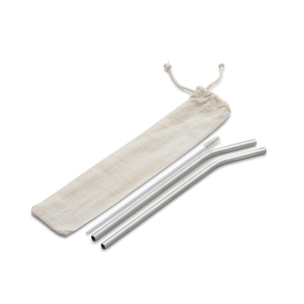Kit com 2 canudos de aço e 1 limpador. Contém dois canudos curvados de 20mm, limpador com corpo plástico e estojo de algodão cru.Altura : 15 cm,Largura : 0,6 cm,Peso aproximado (g): 39. Personalização a laser.