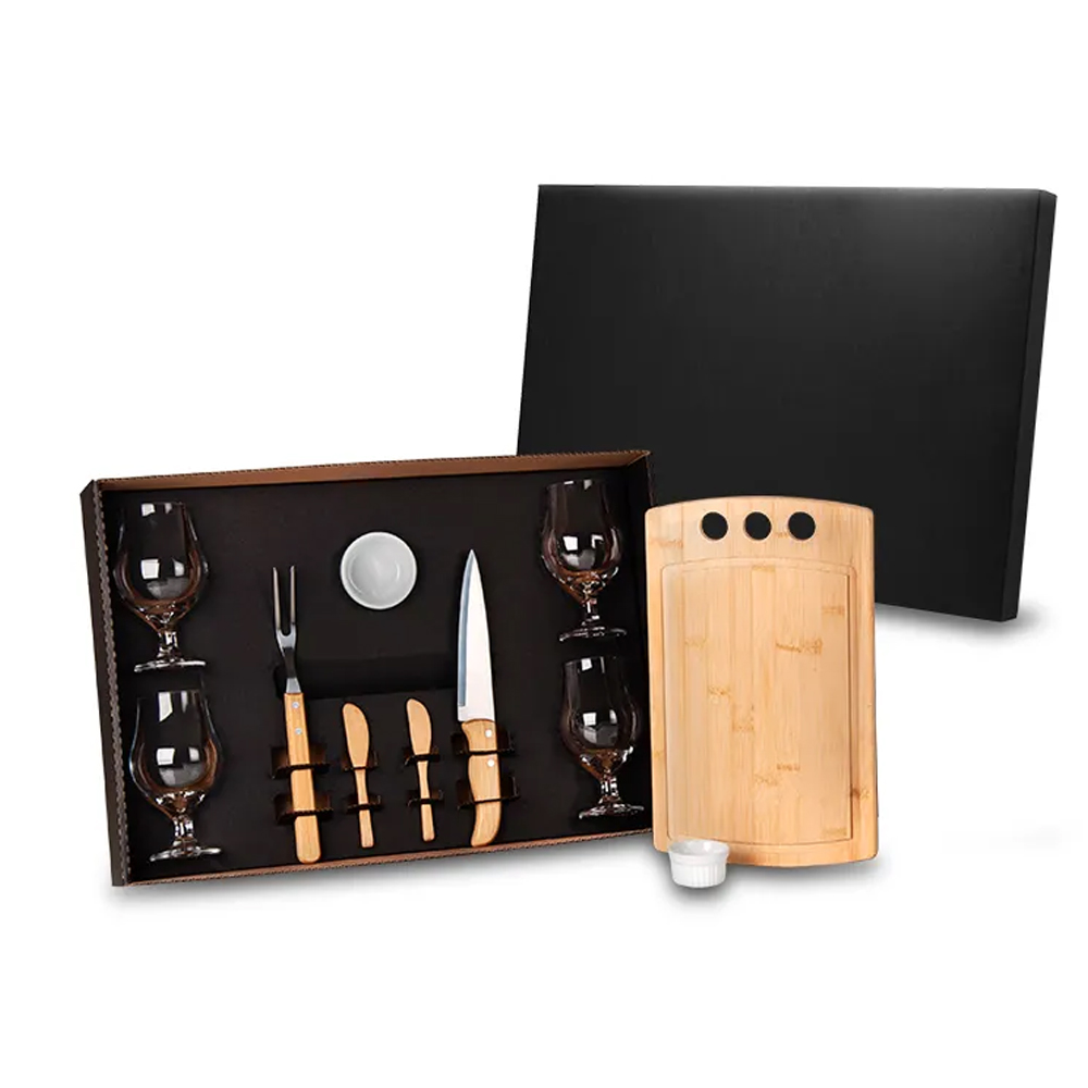 Acompanha tábua com três furos e duas espátulas em Bambu; faca 7'' e garfo em Bambu/Inox; dois ramequins em Porcelana; quatro taças de cerveja em Vidro. Tábua confeccionada com tripla camada invertida. Personalização em Silk sreen.