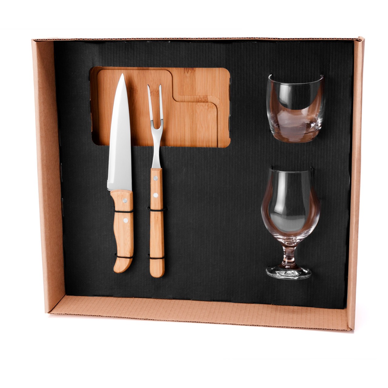 Kit para Churrasco / Cerveja / Whisky Conta com tábua para churrasco em Bambu; faca 7" e garfo em Bambu/Inox; um copo para cerveja e um para whisky em Vidro. Personaliação em Laser.