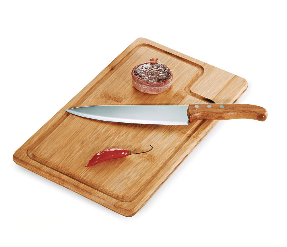 Acompanha tábua em Bambu com sulco e faca 8'' em Bambu/Inox.