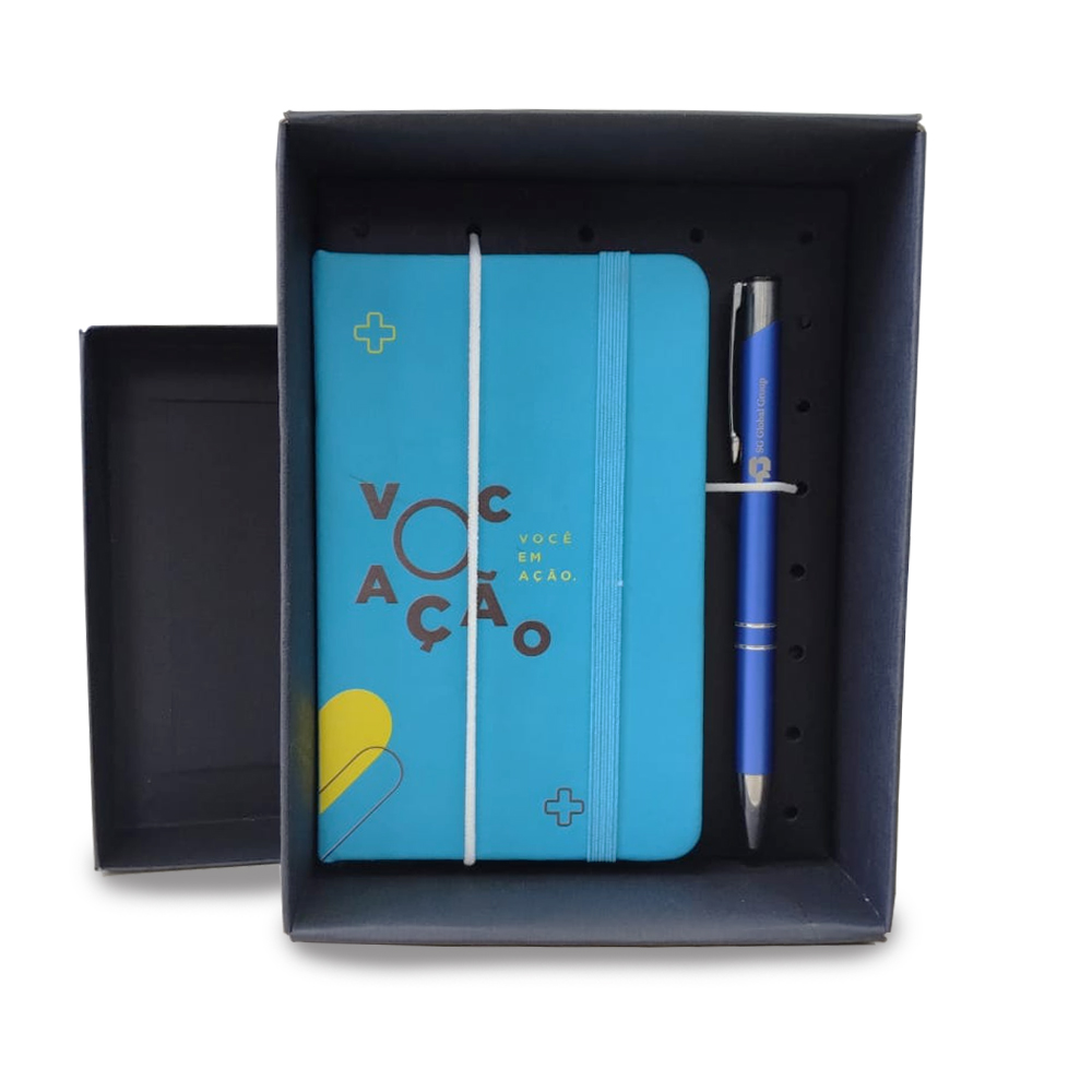 Kit com caneta e caderneta. Personalização em SilkScreen.
