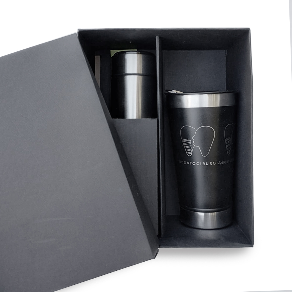 Kit com Garrafa térmica 450ml com termômetro digital na tampa e Copo térmico 500ml, fornecidos em caixa. Personalização a Laser.