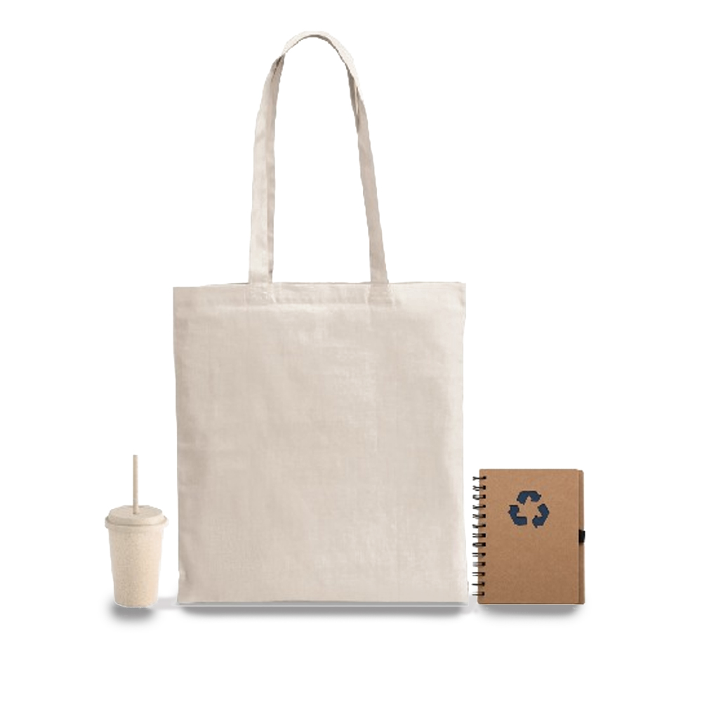 Kit ecológico composto por sacola, copo e caderno. Incluso no valor personalização em SilkScreen na sacola.