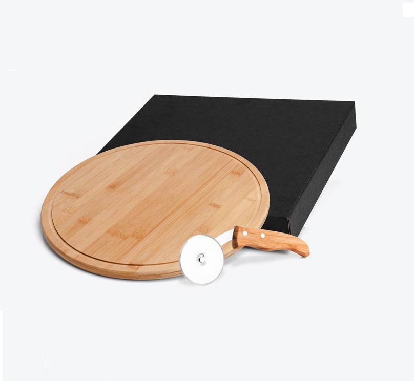 Kit Pizza em Bambu/Aço Inox. Acompanha tábua em Bambu e cortador de Pizza em Bambu/Inox. Tábua: 35x1,2cm. Caixa Preta 355x352x48 mm.