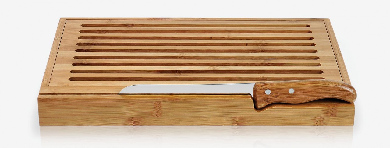 Migalheira em Bambu com faca 7" para pão em Bambu/Inox. Rebites da faca em Aço Inox 304, um dos mais resistentes à ferrugem e corrosão. Personalizaçaão a laser.