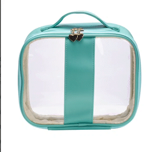 Necessaire impermeável de PVC e PU tamanho P, parte interna com revestimento em tecido, possui alça superior para as mãos, e detalhe dourado em formato de coração no zíper.