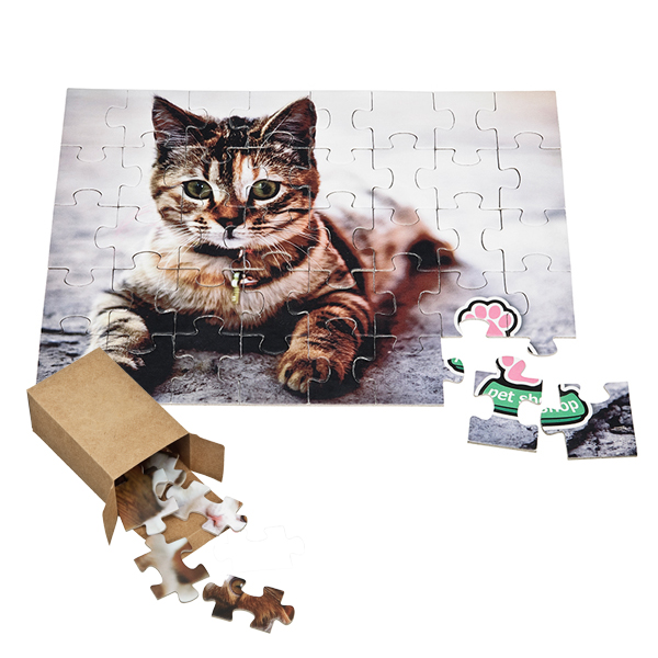 Quebra cabeça com embalagem Kraft. Medida da caixa 10x6,5x4,5cm,Medida do Quebra cabeça montado: 20x27cm, Couche 150- laminação fosca Reveste o papelão. Quantidade de peças: 40 peças. Personalização em impressão 4 cores.
