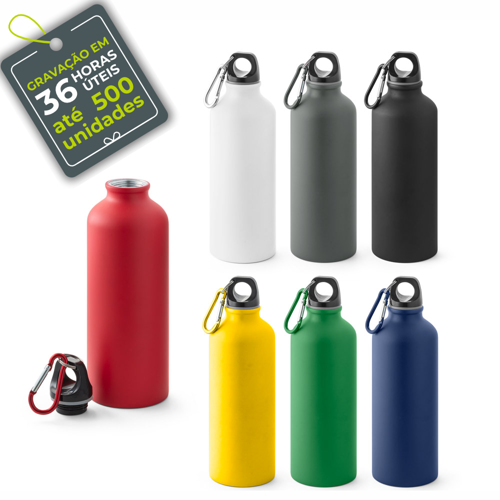 Squeeze em alumínio com acabamento mate e mosquetão para facilitar o transporte. Capacidade até 550 ml. Food grade. Embalagem individual vendida à parte (opcional). Tamanho total aproximado: ø66 x 216 mm. 94246. Perosnalização a Laser.